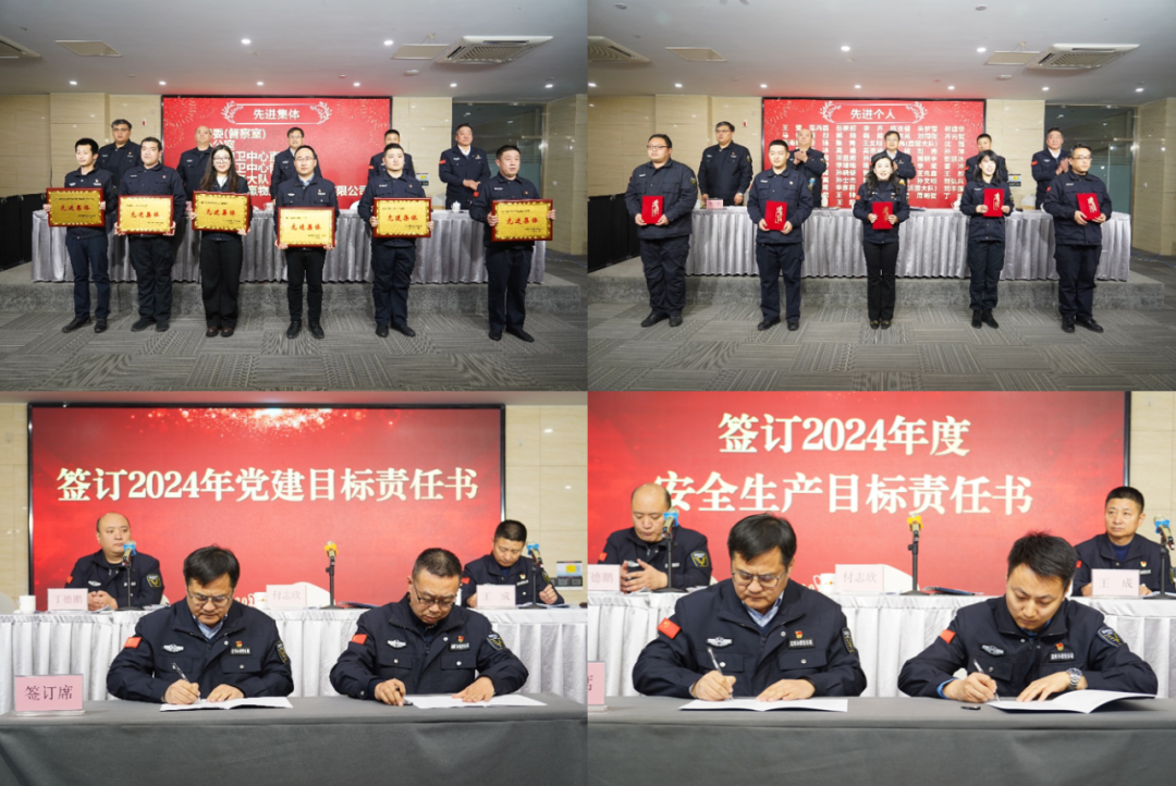 會上宣讀了《關于表彰2023年度先進集體和先進個人的通報》和《關于表彰2023年度優(yōu)秀共產黨員、優(yōu)秀黨務工作者和先進黨支部的通報》。公司領導為獲得表彰的集體和個人代表頒獎,并與相關人員簽訂2024年度黨建目標責任書、安全生產目標責任書、持槍人員規(guī)范用槍承諾書黨風廉政建設目標責任書。